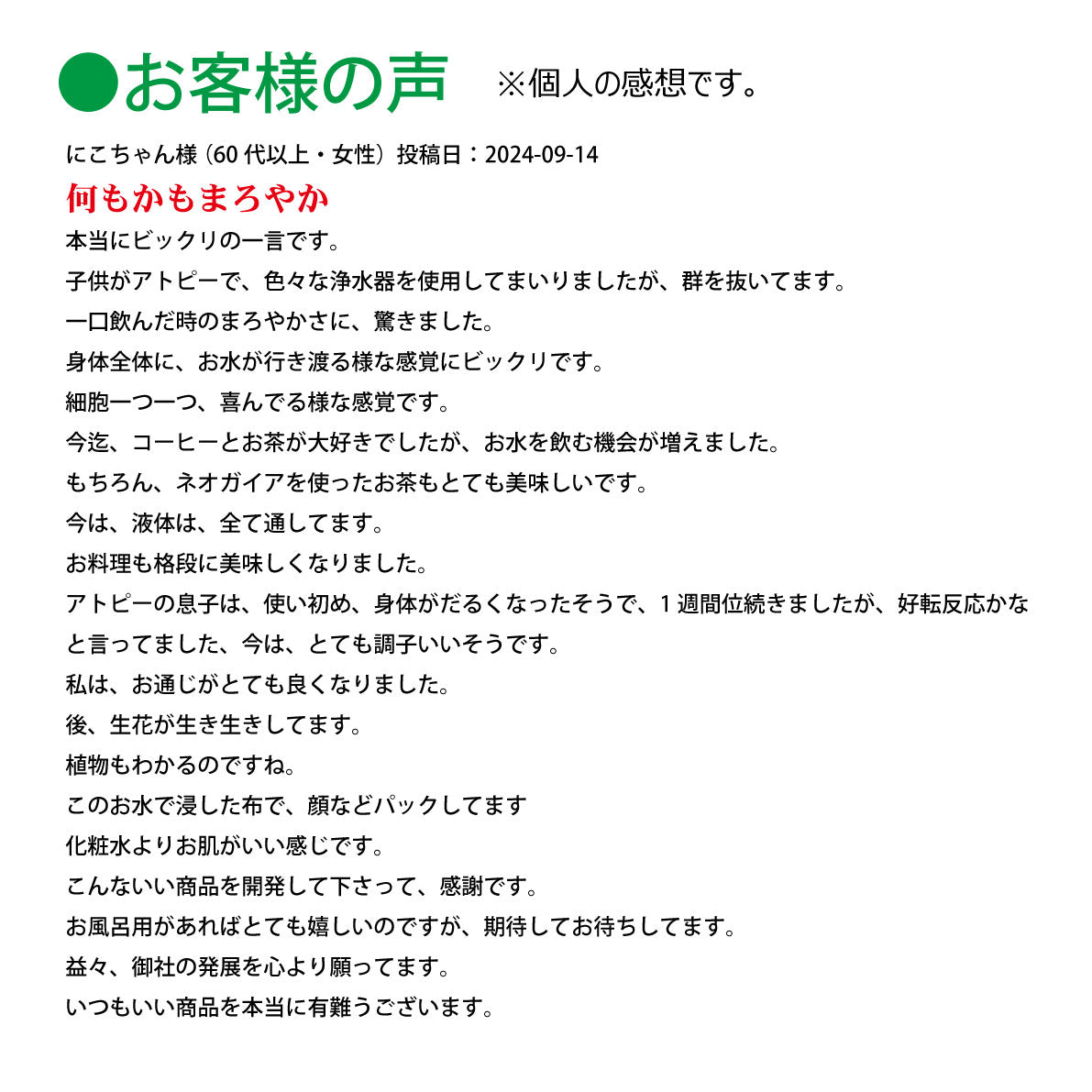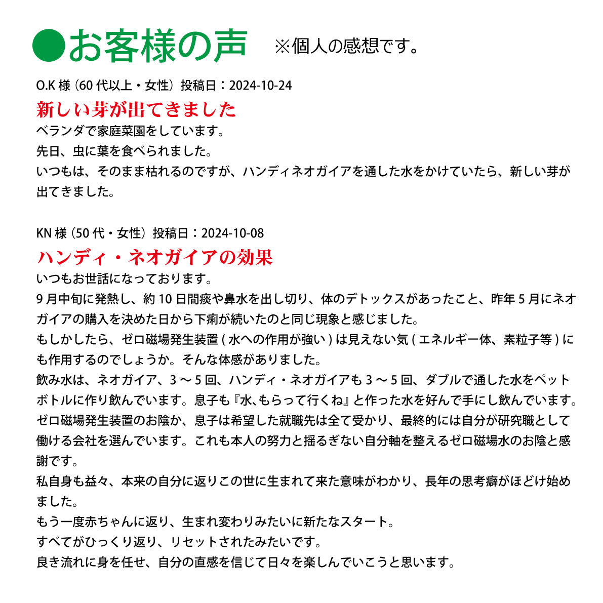 ご好評をいただいております水道管に元付けするタイプの「ゼロ磁場発生装置ネオガイア」を、ハンディタイプにしました。さらに、今までになかった新しい技術を採用することによって、金・銀・銅に加えて、数種類の身体によい必須ミネラルの電子を水に付与することに成功、ますますおいしく、身体に作用する水をつくることができるようになりました。