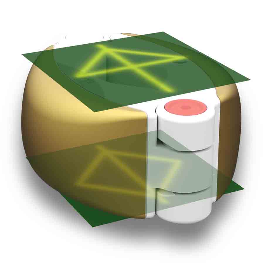こうして作られたテラファイトアースは、磁気フィルムを本体に当てると、地球の偏角0ラインと同じように、片側には十文字(実際には外に斜めの線が出て矢印の形になります)、もう一方には一文字が浮かび上がります。そして、実際に使ってみると、その効果は従来のテラファイトの「ゼロ磁場効果」に加えて、別の特性も備えていました。そこで、試作品を各方面でご活躍のプロの施術家の先生方にお願いし、試用していただきました。