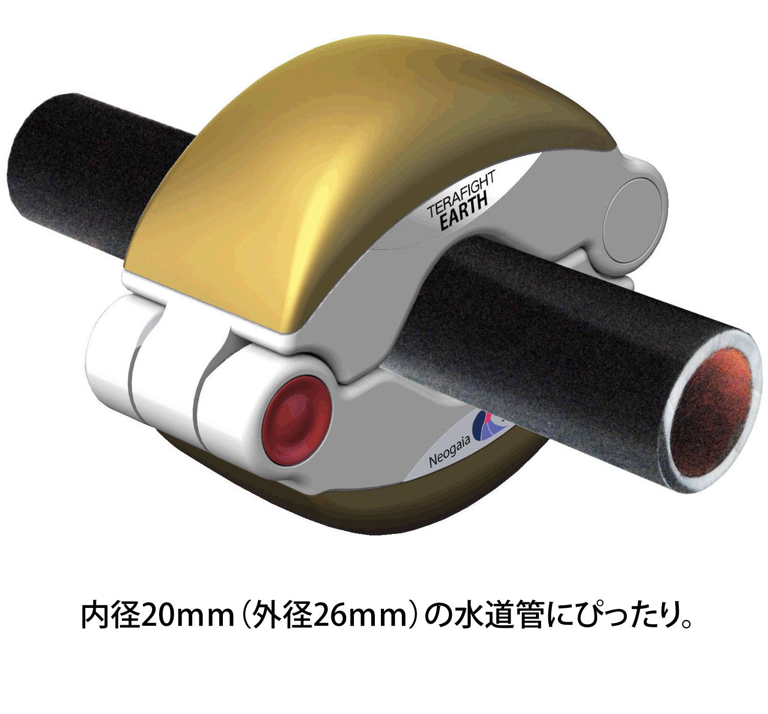 テラファイトアースは基本的には携帯用ですが、一般家庭の内径20㎜の水道管(外径26㎜)をきれいに挟み込めるように設計しましたので、水道管を挟んでお使いいただくこともできます。水道工事の必要がなく、家中の水を「パワースポットの水」にすることができます。(水道管に元付けする場合は、盗難にご注意ください)