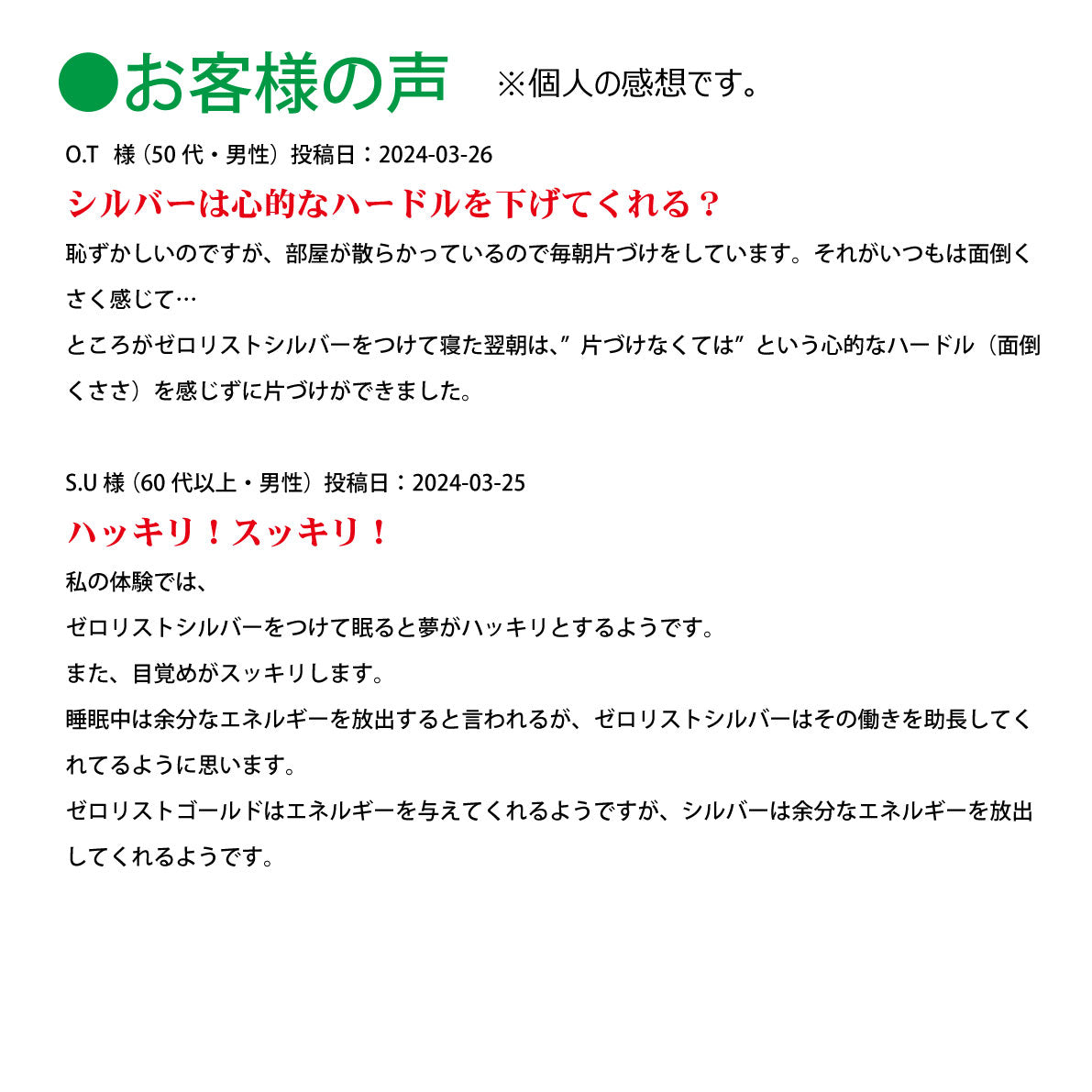 「ゼロリストシルバー」は、持つ人を鎮静・リラックスに導き、意識に溜まった不要な感情やこだわりをブラックホールのように吸収してくれます。それにより、本来の自分の能力が最大限に発揮されやすい状態になります。